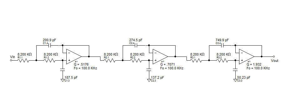 就是我做的100K低通6阶巴特沃斯,用OPA820搭建的,但从10KHZ左右幅度开始衰减,大概到100k时是3db点,所以感觉通带内不平缓,效果不太好。