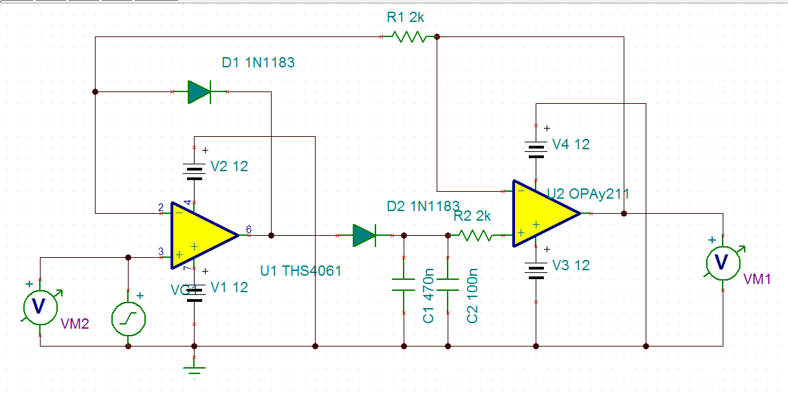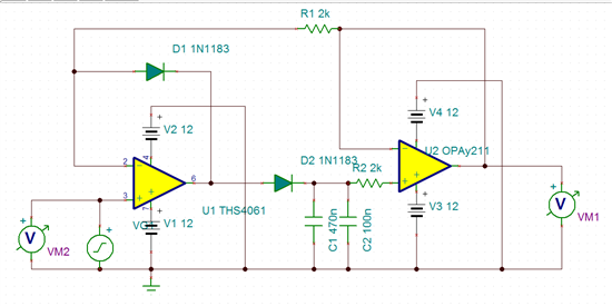 电路图如图。运放采用ths4021,二极管型号为1N4148,想做到6M以上频率,但测试结果不是很理想。请问比较合适的运放,二极管,电容材料?