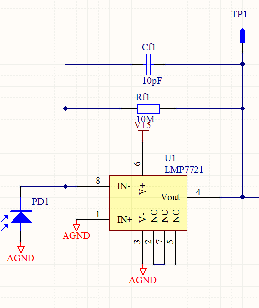 有点奇怪,165mV不对,应该是零才对。LMP7721的失调电压是26uV,偏置电流fA级的,非常小,8脚不会有这么大的电压的。能否先用100Ohm电阻短路光电管看一下这个脚的电压