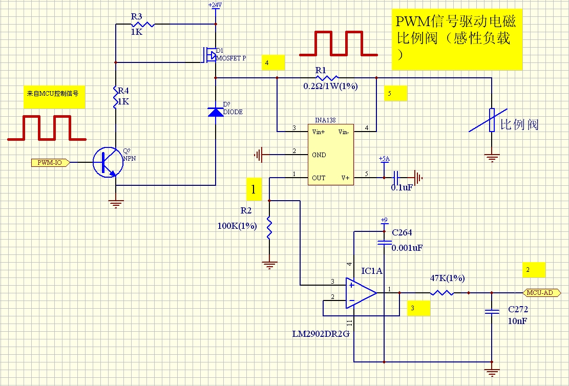 使用PWM(2000Hz)高边驱动比例阀(感性负载),试图使用INA138进行电流采样,电流100mA~1000mA;Rs=0.2欧姆;INA138的放大倍数设置为100k/5k=20倍; 通过47k电阻,10nf电容rc滤波给ad采集;