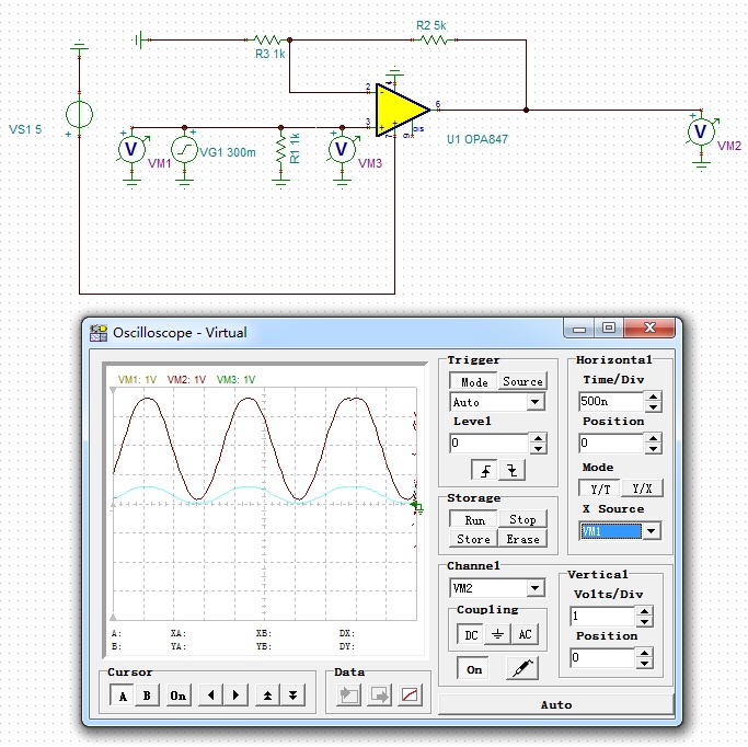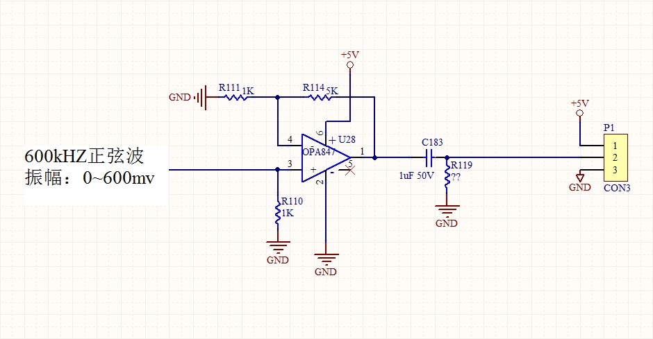 我现在用DDS 产生600Khz,600mv正弦波作为OPA847输入,放大5倍,输出在+5v附近出现类似三角波的波形,换了R114值多次,没用,求高人指点。用TINA仿真完全正常,在板子上就是不输出!!附上原理图和仿真图,谢谢给位高人!!