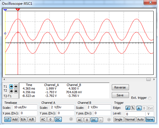 但是实际电路搭建出来测试,从示波器上看明显有2us的误差延时。(输出正弦为50KHz)
