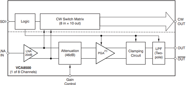您好,VCA8500包括一个前级运放LNA,固定增益20dB,LNA的线性输入电压范围典型值为250mVpp。