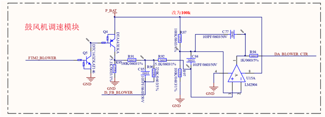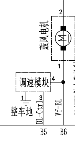 其中FTM2_BLOWER为PWM输入,P_BAT为12V固定电源,IS_FB_BLOWER为可调电压输入,DA_BLOWER_CTR为可调电压输出。(IS_FB_BLOWER和DA_BLOWER_CTR分别对应mos管的栅极和漏极,控制示意图如下图所示,鼓风电机上端也接12V电源,调速模块可简单理解为MOS管,IS_FB_BLOWER对应接Vf-BL,BL_Ctrl对应接DA_BLOWER_CTR)