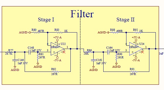 求高人指点,OPA847,sot23封装,正负5V供电,用来做带通滤波器,工作时温度能升高到50度左右,信号频率600K,刚一上电是信号正常,温度升高后发现信号也在衰减,附件较为电路原理图,请帮忙看看。
