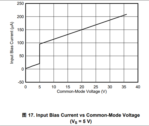 最近在用INA301芯片,因为比较关注偏置电流指标如下图,有一个疑惑,为什么在共模信号给到5V多一点点的时候,偏置电流会突然变大那么多?