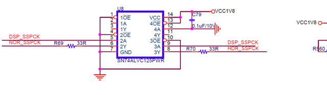应用环境是,DSP(TMS320C6678)只有一路SPI,需要同时接到norFlash和FPGA上,DSP提供了两个片选信号,图中芯片SN74LVC125PWR输入信号是由DSP提供的SPI时钟,SN74LVC125PWR放在这里的功能是什么,SPI的时钟不能驱动两个芯片吗