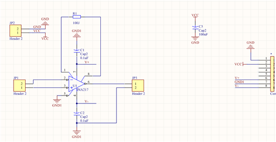 下面是电路图,我采用5V供电,DC-DC模块隔离变成正负5V后为INA217和AD623供电,最右边的长条是DC-DC模块,型号为WRA0505S-2WR2。