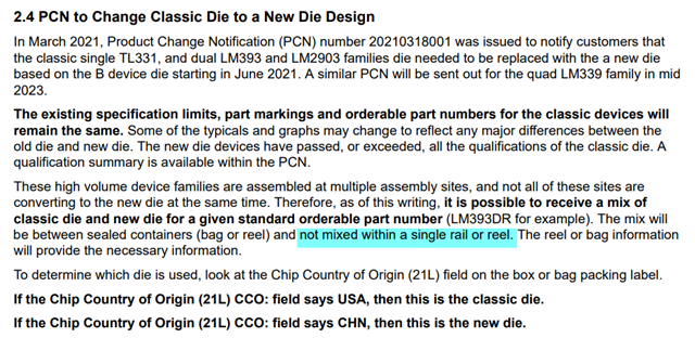 LM393DR 为什么新型裸片和经典裸片共用一个Vendor PN,而不是各自有自己的PN。两种不同的裸片功能上已经有差异,为什么用的还是同一个PN呢?谢谢。