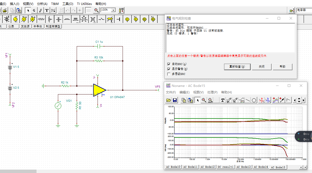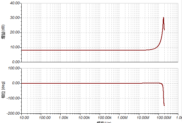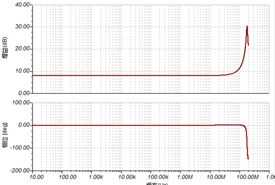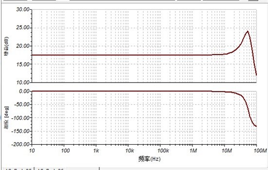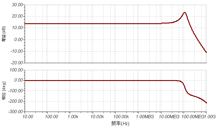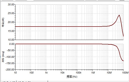 搭建的电路图以及频率响应图如下,我要实现电压15倍的放大,工作频段在200K到100MHZ。为什么在20M之后相位出现偏移,以及增益有个波峰?该如何解决?新手求指教!