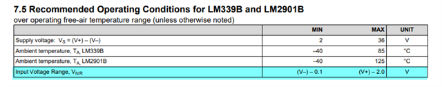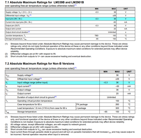 与上面的情况一样,IN+, IN– 在如下截图绝对最大额定范围内,都不会损坏比较器,但是不管6V还是4.5V,都超出了推荐的输入范围,因此不能保证其电气特性。