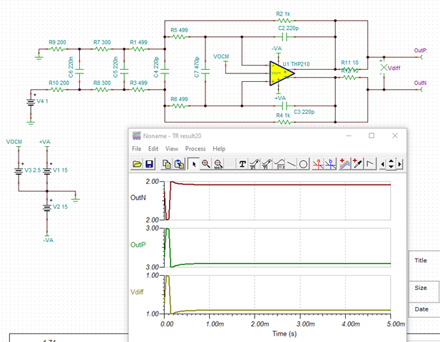 THP210的测试电路如上。输入的信号是DC 1V信号,测THP210的pin4脚是接近+15V,pin5脚是接近-15V。即差分输出接近电源轨。上电后芯片耗电大概10mA左右吧,芯片也不怎么发热,我核查了电路中的电阻阻值,也都是对的,放大倍数1倍应该是没有错。我拆换了三颗THP210现象都是一样的。实在不解是什么原因
