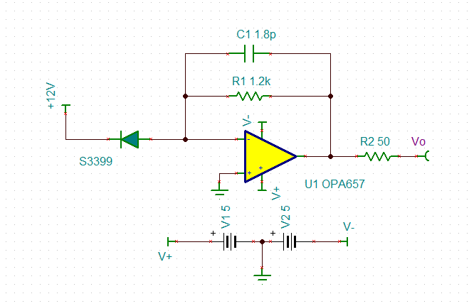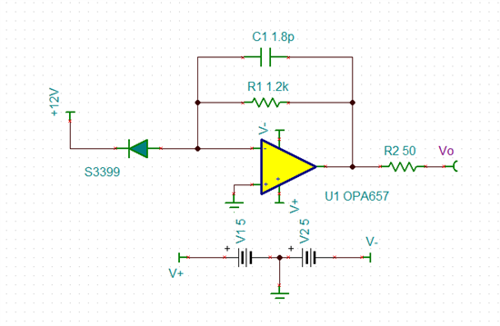 这个是我按照OPA657那个跨阻放大电路手册里,尝试连接的一个图,R1,C1也是我按照里面为了获得平坦的二阶巴特沃兹频响计算得到的,S3399为PIN光电二极管,结电容20pF,接上电后,光电二极管没有对准光源时,Vo有个400多MHz的正弦输出,请问下,这个正弦信号怎么产生的?