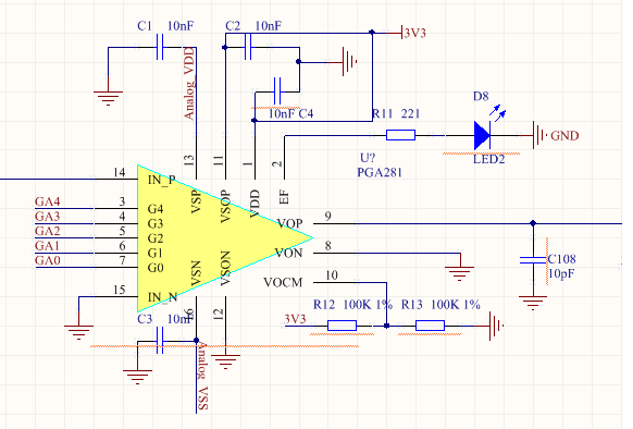 点入如附件图,输入IN_N和 VON接地,VSON接地,VSOP=VDD=3.3V,输入信号500mVpp,1Khz,G4G3G2G1G0=00011,就是增益1倍,但是输出只有0.8倍左右,当把3.3V换为5V时,增益接近1,但是我的单片机是3.3V系统,请问如何解决?还是我的电路有问题?
