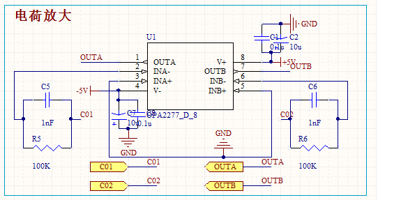 接线:4接-5V,8接+5V,3、5脚,即两个运放的正端接GND。2、6脚都接上:1nF电容和100K欧电阻的并联,C01和C02没接信号,无其余信号输入。。。 用示波器测了下,2、6、3、5脚约等于0V,4脚-5V,8脚+5V!问题来了:1脚OUTA和7脚OUTB居然都有类似方波的周期性峰峰值为7~8V的信号!这个信号从何而来?1、7脚在没有信号输入的情况下不也应该为0V么!? 求各位大神了。百思不得其解。 特别急