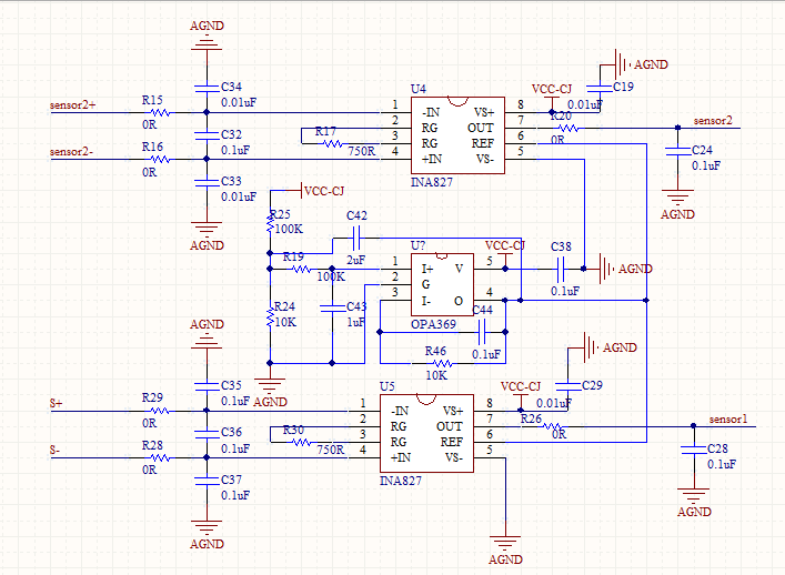 我目前用到两个仪表放大器,需要的基准是一样的,我想只用一个基准同时提供给俩仪表放大,不知道这样的方法可行否?请大侠们指点一下,基准是由电源分压,然后通过一个有源滤波器形成的,具体图纸在附件中,顺便也请大侠看看该电路有哪些不足,本电路主要用在仪表上,出于低功耗的考虑,只会在需要采集时才短时间开电,