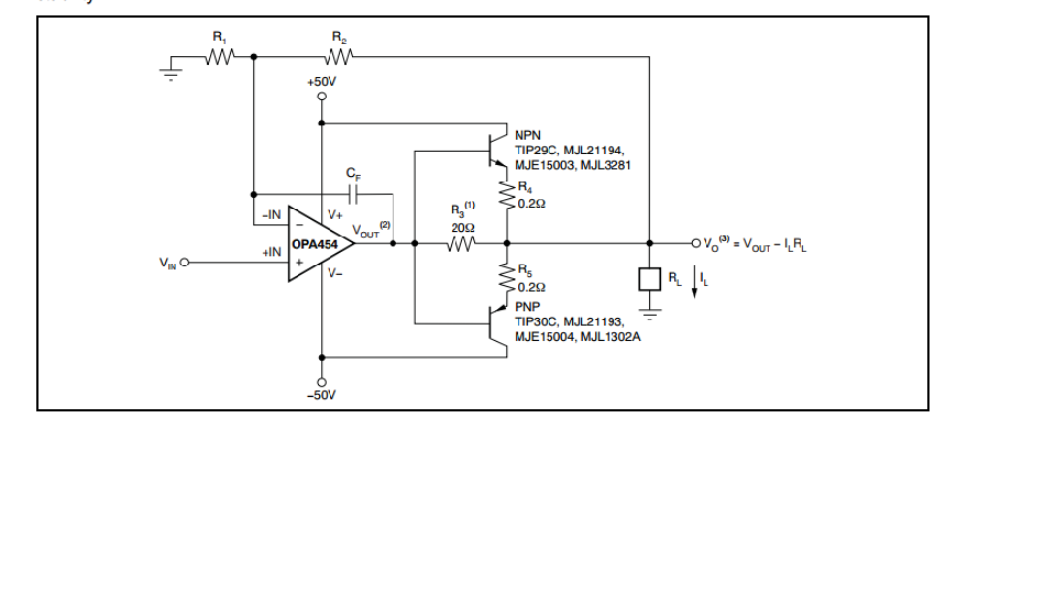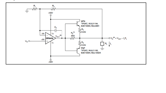 我用了OPA454组成的电流源电路,如图所示,但是和图中的主要区别在于我的负载部分为图中的R2部分,三极管输出端没有电阻RL。电流源输出经过电缆连接到负载电路中。