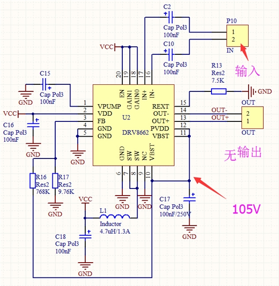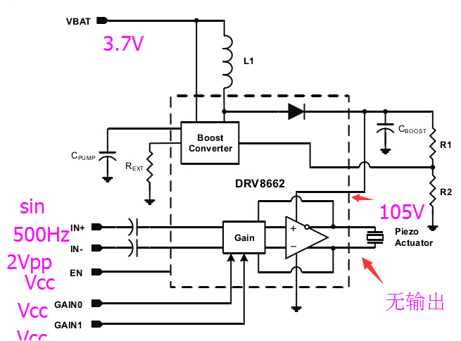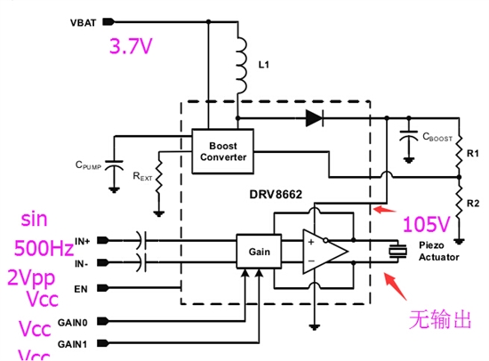参照8662的结构图,只要能在11脚输出高电压,说明升压正常,没有输出只能是放大器环节的问题。初期怀疑是不是没有负载,直接用示波器观察就不行。给输出端接了50nf的独石电容作为假负载,仍然不行。实在是令人头疼。