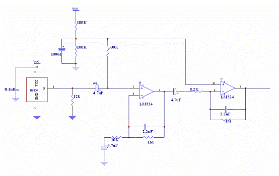 我现在要放大一个模块的输出信号,模块供电电压5+-0.25V,输出电压幅度为+-20mv以内,频率1K赫兹以内(是一个微波多普勒的模块),我现在要把波形放大到0—3.6V,通过TM4C的ADC采集波形分析,所以对放大精度要求略高,现在出现了点问题。模块推荐的外围电路如图: