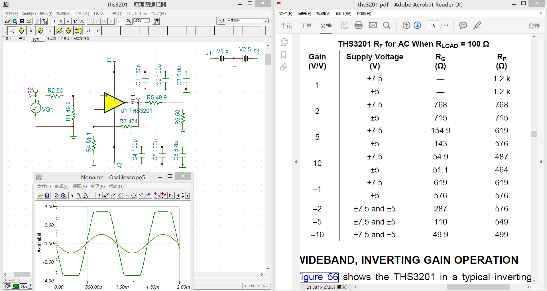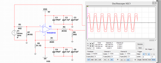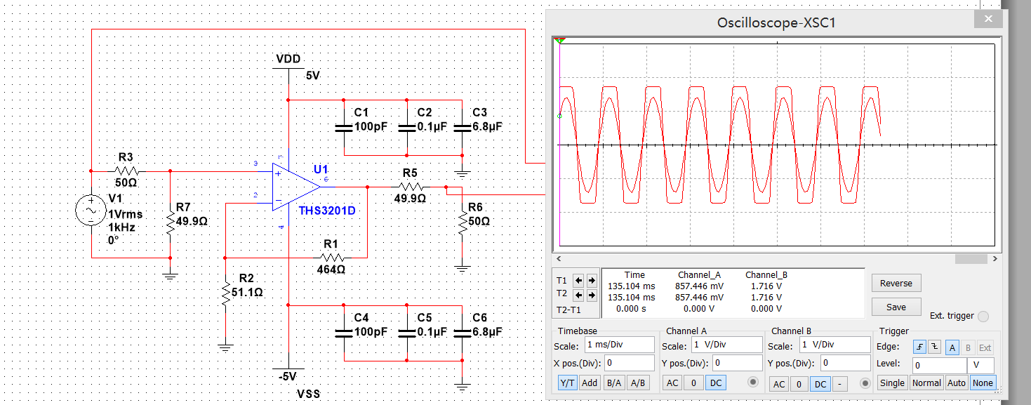 1. Gain=2时,Rg和Rf都取715Ω,波形输出正常