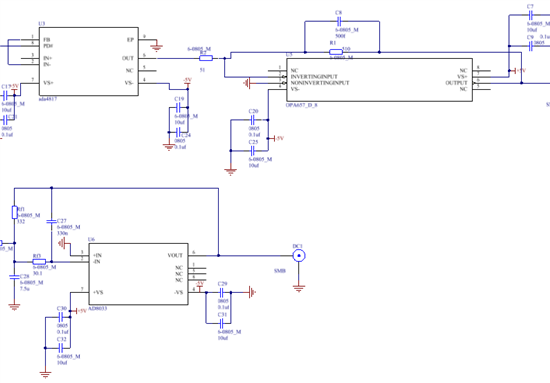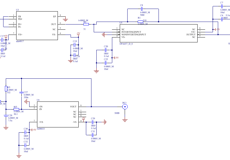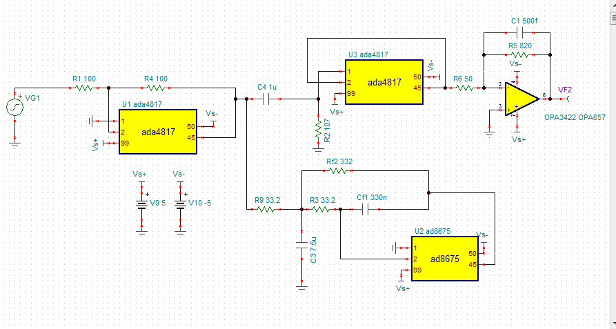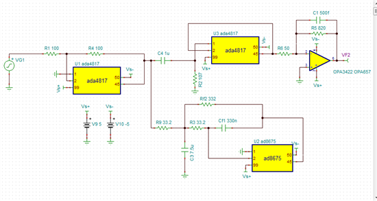 如题,设计的opa657放大电路,电压放大10倍,可实际的只有7倍这样。。。 后来第一级放大2倍,增大了opa657那一级的反馈电阻,放大16倍,总的放大32倍,实际测出来只有21倍这样。最后问题出现在opa657那一级上。。。 自己设计的没错的。。。 求解