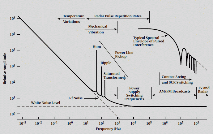 横轴是频率,左边是低频、超低频,主要是1/f噪音,右边是比较平的、不随频率改变的白噪音。另外还有其它多种,大部分为外部的噪音。