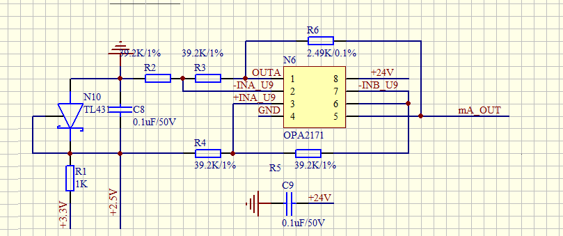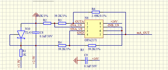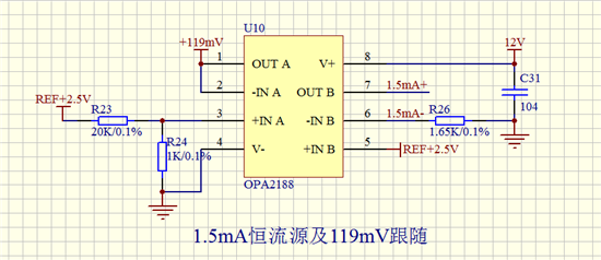如图,使用OPA2171和使用OPA2188分别产生1mA恒流(OPA2188的R26已改2.49K,1.5mA成为1mA),激励压阻式压力传感器,传感器桥阻约为3~5K,OPA2171激励桥阻输出共模电压约1.8V(=3.5k*1mA/2),OPA2188激励桥阻输出共模电压约4.4V,这是什么原因?两种恒流的差别是什么,感谢。