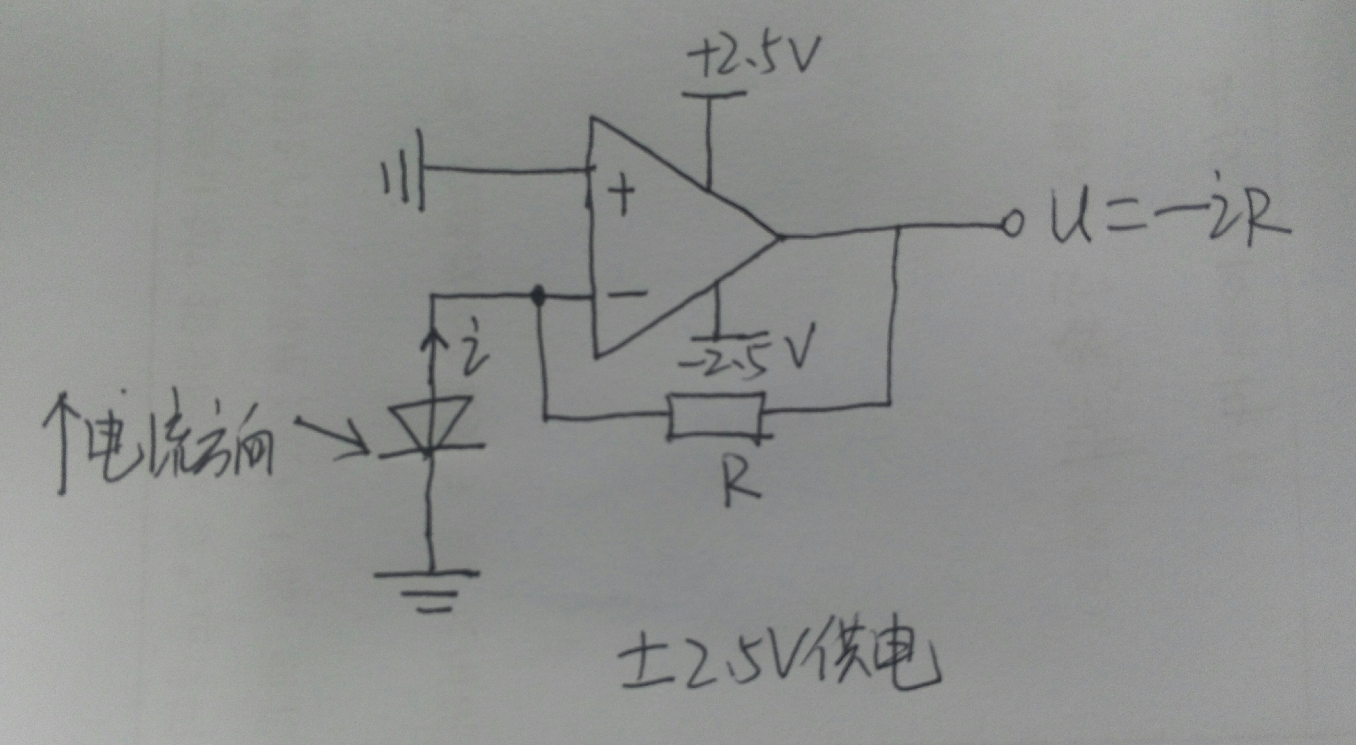 如上图设计了一个光电二极管的电流转换成电压的电路,光电二极管的电流方向是从GND流向运算放大器的负输入端,运放输出电压U= -i*R,请问这样设计的电流转换电压电路对吗?