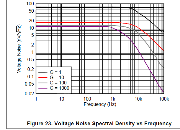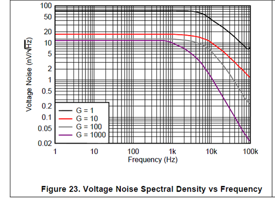 figure24和25的噪声均为折算到仪表放大器输入端(RTI)的噪声,即仪表放大器输出噪声(RTO)除以增益,所以增益G=1000的仪表放大器折算到输入端的噪声应该比增益G=1小,这从电压噪声figure23图可以看出。此外由于运放的增益带宽积一定,所以增益G=1000比增益G=1时运放的带宽要小,带宽越小,对于同一运其输出噪声越小。对增益G=1,其输出噪声=输入噪声,但对于增益G=1000,其输入噪声=输出噪声/1000。所以我怀疑figure25的电压噪声是相对于输出端(RTO),而不是规格表所写的RTI,规格表在此处有误。