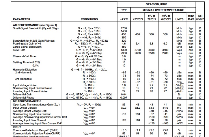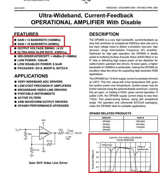 请问芯片OPA695可以放大频率为200MHZ左右,将100mv信号放大250mv吗,(增益8db,输入40dbm,输出48dbm)。