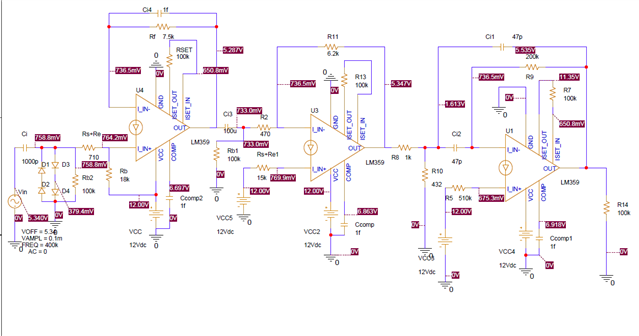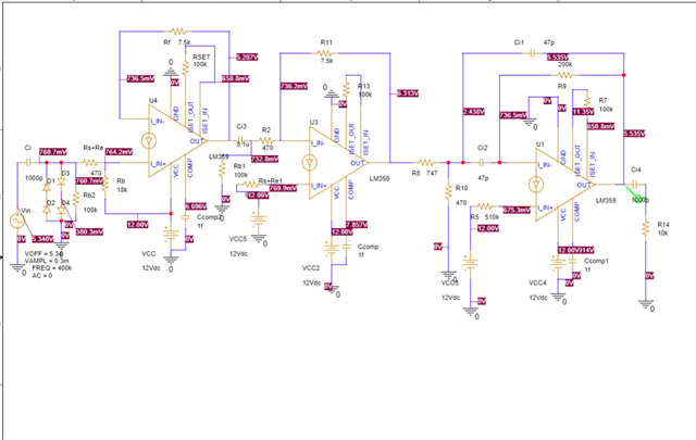 如图片中的电路 实际通电后,为什么在第一级的非反相增幅电路的出力部分会有这么大的噪音,用示波器测的图像就是噪音图像。LM359用的是单电源12V。拜托,请帮助我!