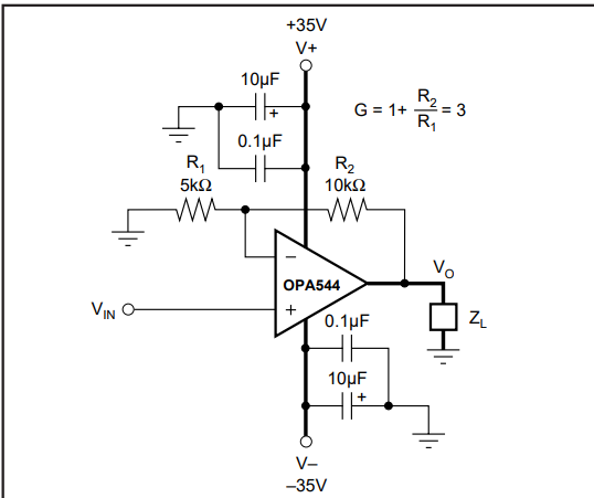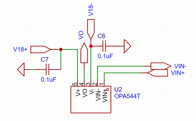 我正在测试OPA544的功能,结果遇到了严重的震荡问题。以上是我的原理图,使用±18 V供电(在供电端再接对地10 uF电容后无影响),无论VIN+接什么,只要VO和VIN-连接起来(无论是直接连接还是通过一个68k的电阻连接),VO都会出现几个V的震荡,并伴随急速发热。在反馈回路中加47 pF到100 nF的电容均不会影响这一现象。无论是在面包板还是PCB板上都是同样的现象。更换了3个OPA544,均有相同情况。