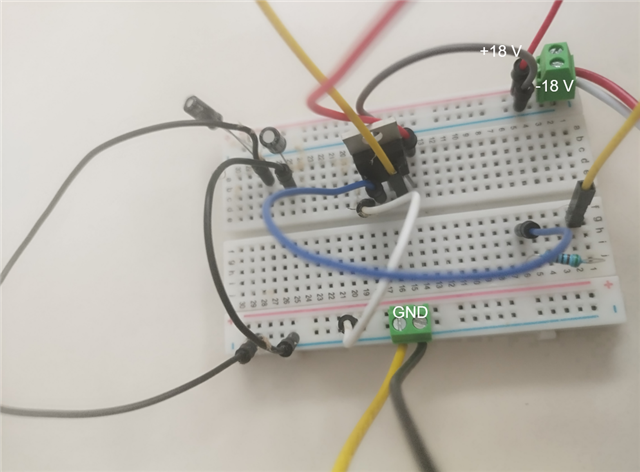 • 这是我在面包板上的一个典型调试电路,其中VO和VIN-通过6.8 k的电阻连接,VIN+接地,一旦通电立刻出现上述问题。