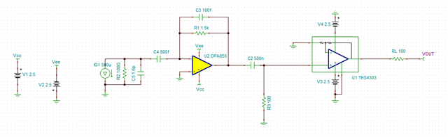 THS4303: 第一级使用OPA855,第二级使用THS4303进行两级放大