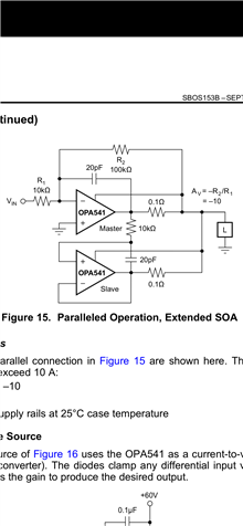 采用手册中图15推荐的并联电路,测试时两个运放供电均为±35V,输入信号VIN为负时,主从运放均流 ,测试检流电阻上的电压基本一致,当VIN信号为正时,主从运放不均流,电流全部从主运放走,从运放未输出电流