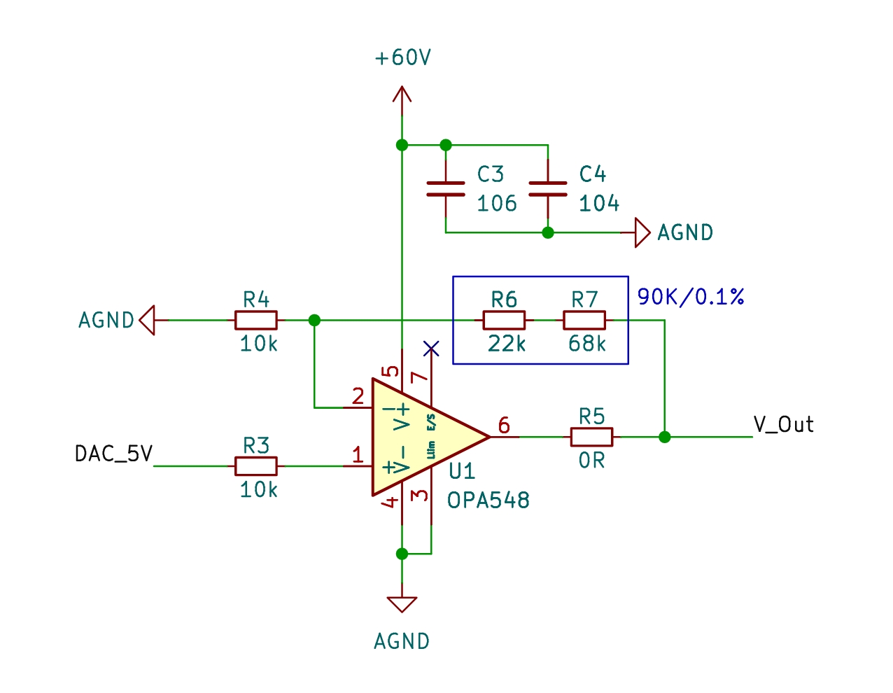 原理图如上,我查阅OPA548的规格书中是写的在单电源操作中,输入共模范围可扩展到地电平以 下;但是在该电路中,我在DAC输出0V(DAC自带偏移10mV)的情况下,OPA548的输出端依然有近500mV的输出,这是否有办法改善?
