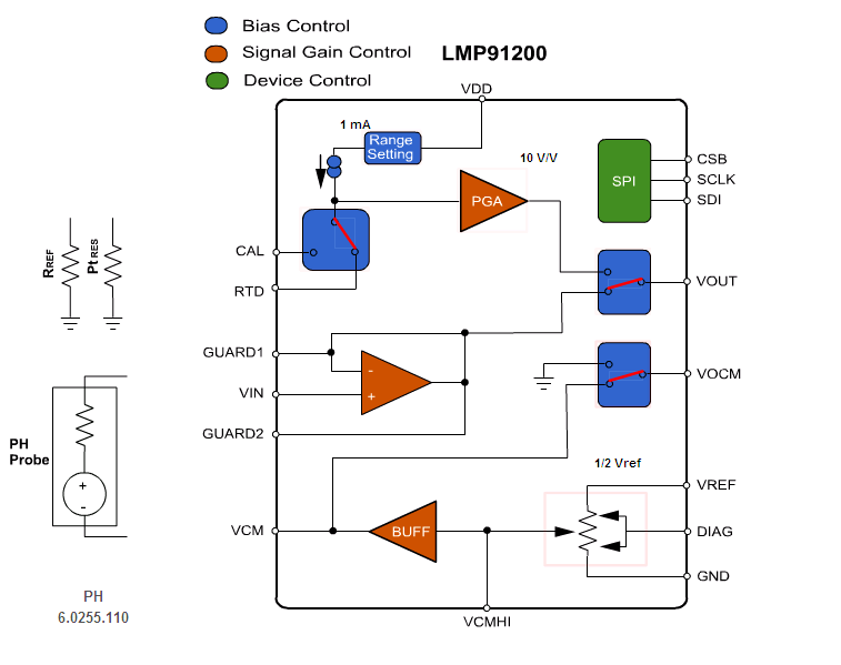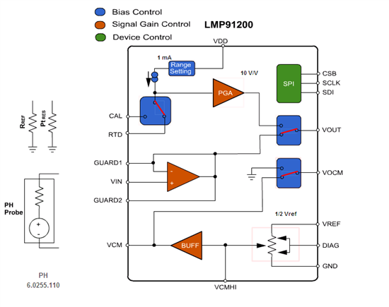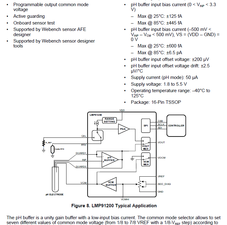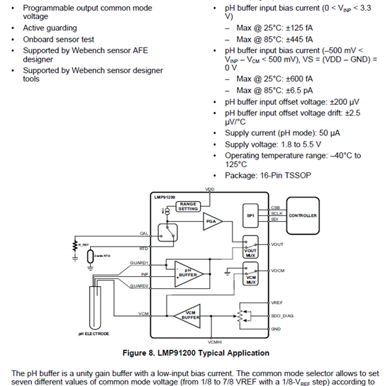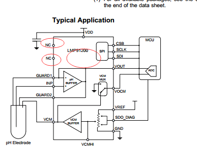 我想用LMP91200做一个PH值传感器,根据TI的参考设计发现芯片资料和参考设计上不一样,红色部分