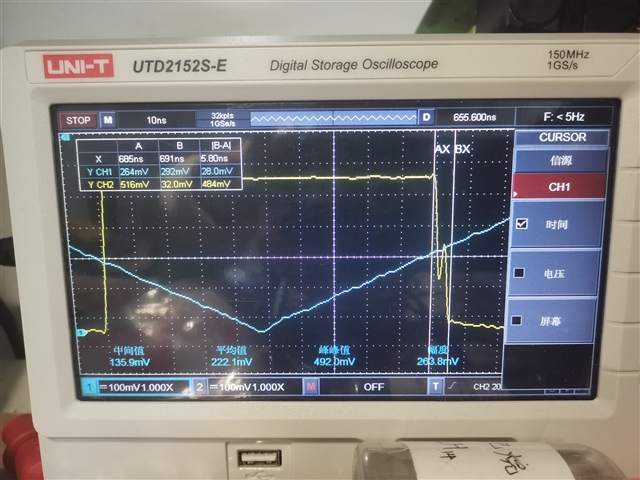 我使用±2.5v电源为比较器供电,正相输入端接地,通道1是反相输入信号(约5Mhz的三角波),通道2是输出信号。我使用了1uF、100nF、100pF的去耦电容,输出阻抗大约1kΩ。有时候输出的下降沿会出现图中的震荡,出现这个的原因是什么?如何解决? 我的探头处于10x衰减,接地弹簧连接到-2.5v测量。
