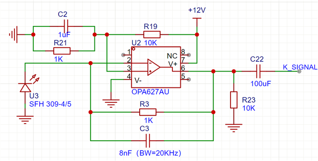 专家你们好,我尝试使用OPA627构建一个跨阻放大器用于检测特定强度的光强,我使用了SFH309作为光电二极管,使用以下电路进行构建