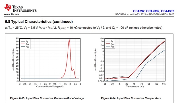 最后但并非最不重要的是,请注意,+/-0.8pA的最大Ib仅适用于25°C,在125°C时可能增加至+/-30pA (参见图6-14)。 此外,如果输入VCM相对于负极轨高于3.75V,Ib可能会进一步增加(参见图6-13)。