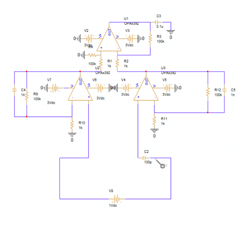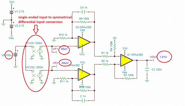 • 谢谢你的回答,但是我并不是放大1V电源信号,而是放大C2传感器和电源V8的电势差,高阻抗让传感器在短时间内视为断路,移动C2传感器的极板将改变C2左端电势,通过比较传感器电势变化来计算位移,V8相当于一个电容传感器初始的参考电压,通过计算发现OPA4392的温漂和Vos可以忽略不记。主要问题是,我在用PSpice for TI仿真时如果将V8接入地的话,结果会显示放大电路的电流和电压不对称,这会不会造成什么不好的结果