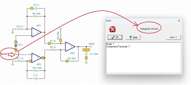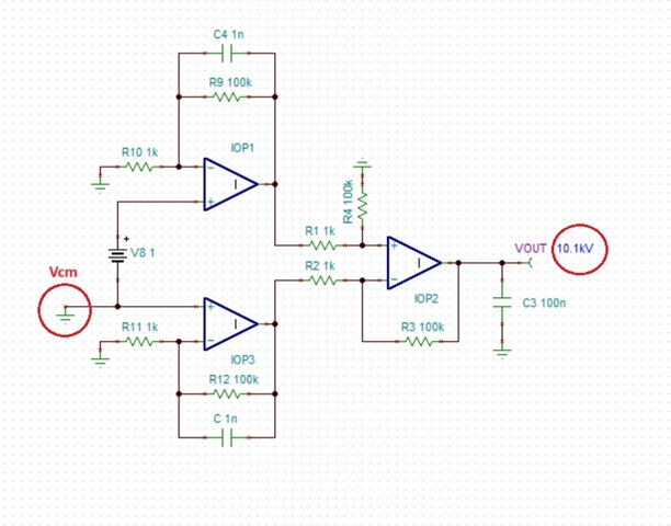 2.将VCM引用到系统接地解决了浮动VCM问题。 但是,您不能应用1V差分输入信号,因为电路会尝试通过G=[(1+100k/1k)*100k/1k]=10,100的组合增益放大它,从而将输出电压驱动到10,100V,从而导致输出靠近其电源电压的轨道-参见下文(使用理想运算放大器)。