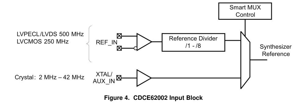 这个好像不可以,cdce62002输入的2M时钟是通过晶振提供的,我要输入的是2M的数字信号,并从输入信号中提取发送端时钟,如果能把这个时钟倍频更好。