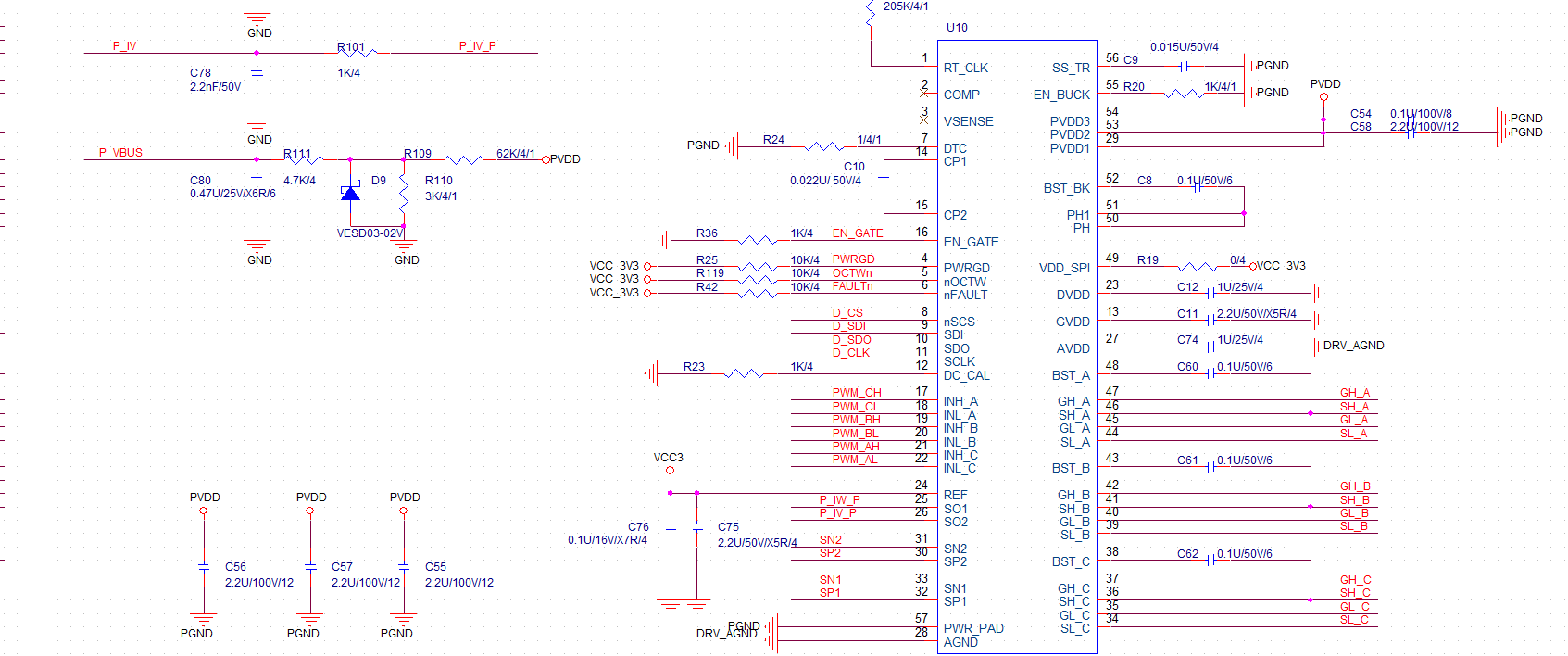 最近在调试DRV8301的时候出现了一些奇怪的问题,我没有用8301自带的BUCK,在EN-GATE后,里面的LDO产生的AVDD为6.5V,DVDD为3.3V。电核泵产生的电压10.5V左右,电核泵电容两端的电压比较正常,SPI通信正常,读两个状态寄存器都是正常的。