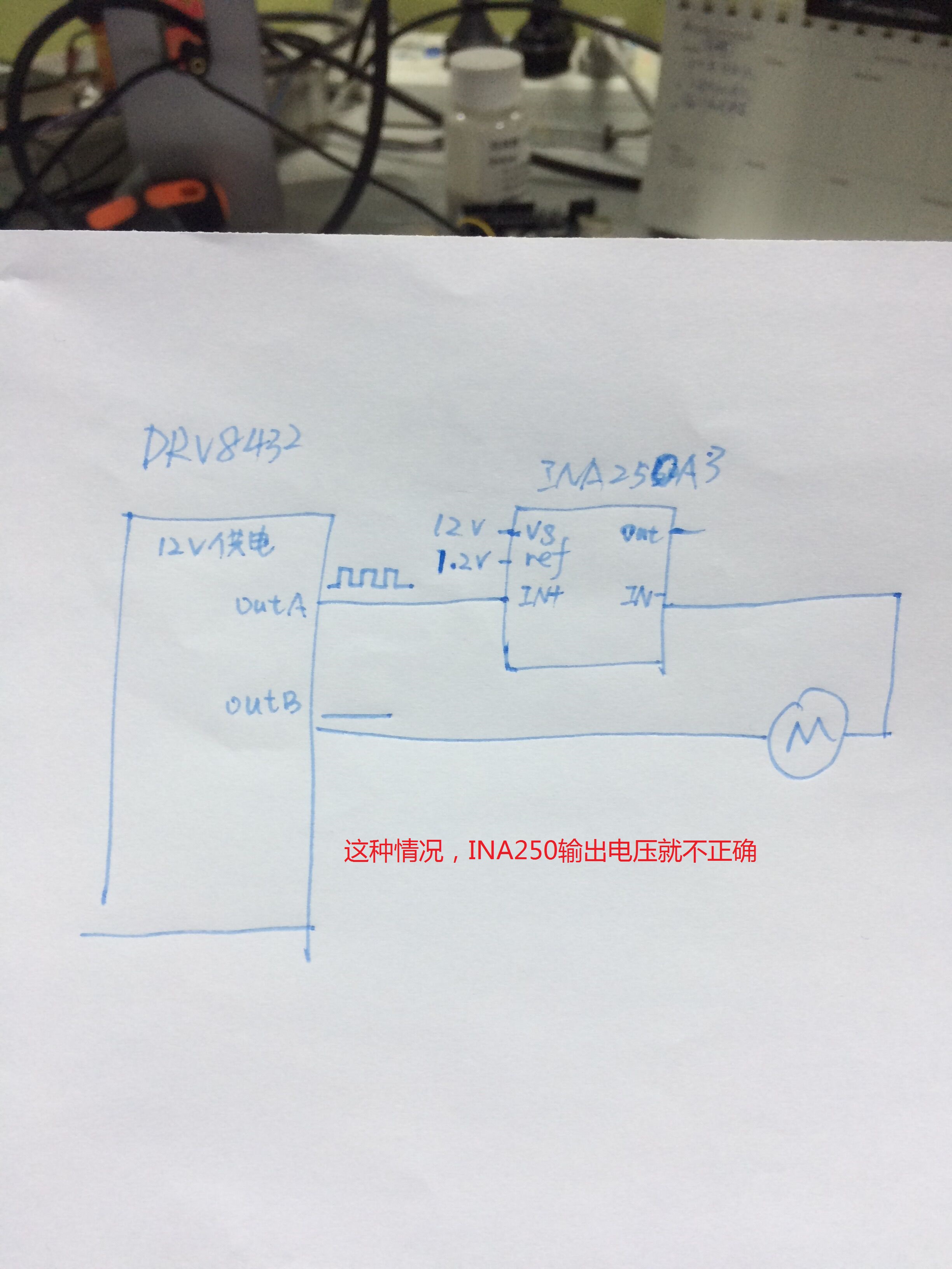 问题1:上面INA输出不正常的情况如下。电路见图片。当我OUTA输出波形的时候(电机堵转),INA250输出的电压值就不对(代表电流大小),基本都很小,按理说应该逐渐增加。可是按照上面的电路,将OUTB输出波形(也就是让电机反转),INA250的输出电压值变化基本都是对的。为什么会出现这种情况呢?