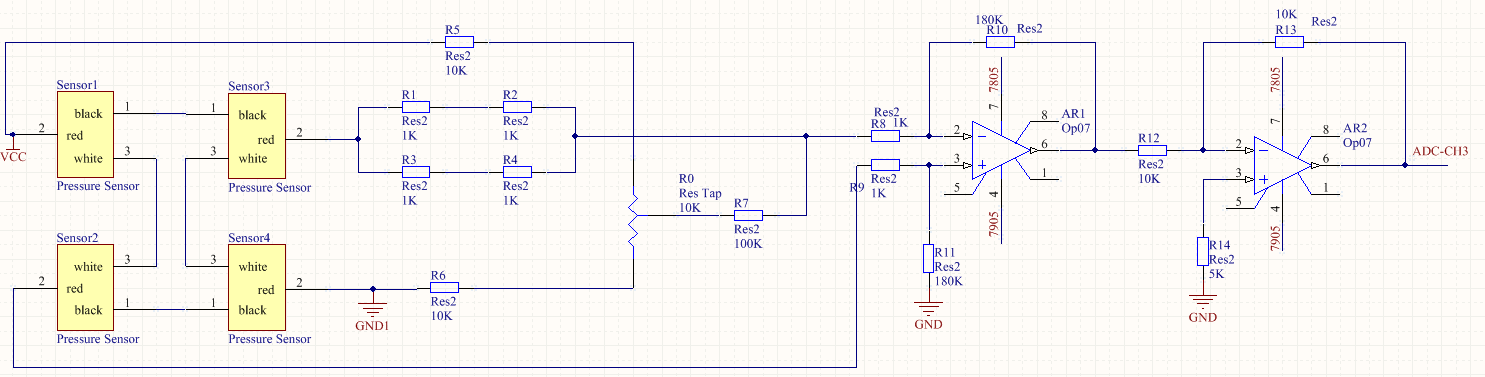 传感器使用的是三线的压力传感器,刚开始的时候我是单独电池供电的,VCC为8V左右,GND1为电池的地;现在给放大器供电使用的是直流稳压电源提供的正负5V,ADC-CH3接入到CC3200进行数模转换,放大器的地和CC3200的地是同一个,这样的数据出来之后是正确的。