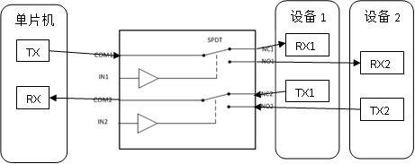 比如单片机使用一个uart去和两个设备通信,允许分时通信。我使用TS5A23159(如图)将RX和TX在两个设备之间切换,可不可以呢。注意RX和TX的信号方向正好是相反的。