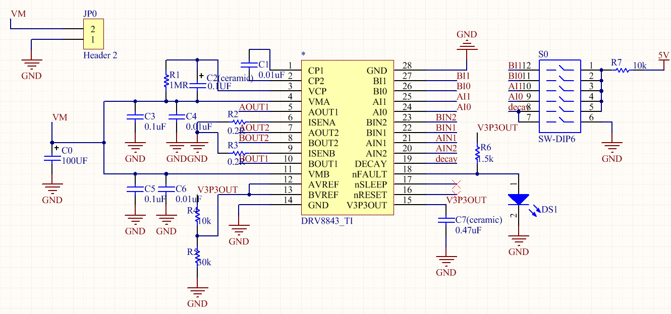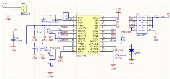 按照datasheet设计了如下的原理图 不知道为什么拨码怎么调整,PMW 波给3.5k 幅值3.3V 怎么接到输入端,都没有电机都没有反应,一点动静都没有。然后nFAULT 也没有输出高电平,学生电源接12V输出,但一点电流都没有,感觉是芯片根本没有工作,求解释哪里出问题了?