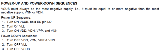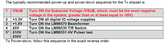 各位大神,我最近在调发射芯片LM96551,开始没有管上电顺序,所有电压都同时上电,开始还能正常工作,但是后面某一次一上电就烧了,不知道什么原因,只能猜测是不是和没有遵守上电顺序有关。现在看手册中说上电顺序如下图,