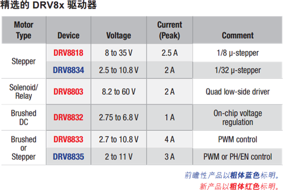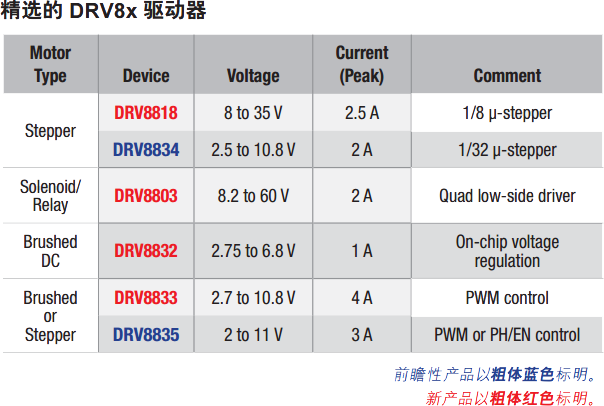 Tl拥有门类宽泛且具备不同集成度、多种控制接口和众多额定功率的电机驱动器产品线。DRV8x系列包含驱动器和前置驱动器.可支持2V到60V的电压范围以及高达60A的负载电流。